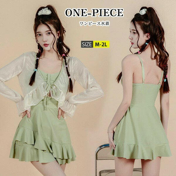- 水着 レディース 体型カバー グリーン 3点セット 服みたいな ワンピース水着 ボレ...