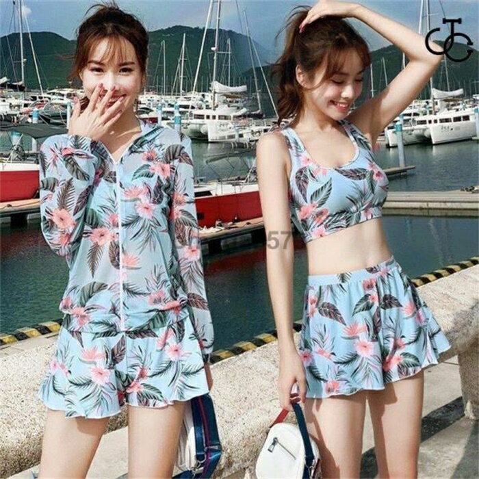 - 水着 レディース ビキニ 4点セット パーカー ショート丈 花柄 ラッシュガード 長袖...