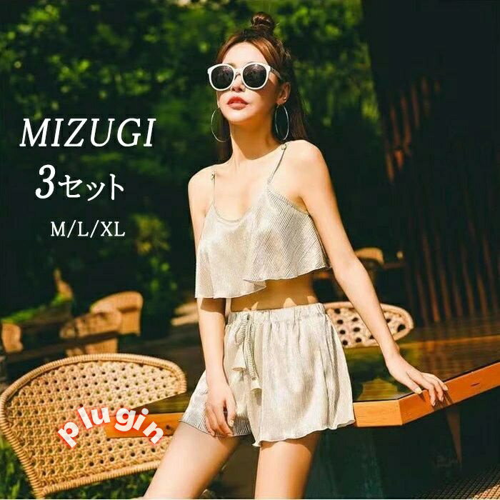 - 水着 レディース ビキニ タンキニ 体型カバー 3点セット シルバー ショートパンツ ...